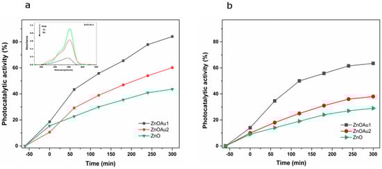 - Georgiev, P.; Kaneva, N.; Bojinova, A.; Papazova, K.; Mircheva, K.; Balashev, K. Effect of gold nanoparticles on the photocatalytic efficiency of ZnO films. Colloids Surf. A Physicochem. Eng. Asp. 2014, 460, 240–247. [Google Scholar] [CrossRef]