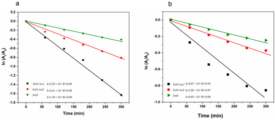 - Fageria, P.; Gangopadhyay, S.; Pande, S. Synthesis of ZnO/Au and ZnO/Ag nanoparticles and their photocatalytic application using UV and visible light. RSC Adv. 2014, 4, 294262. [Google Scholar] [CrossRef]