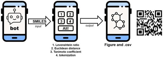 Overview of Telegram bot for the search for molecules sensitive to various cations. The QR code can be used to access the Telegram bot. The user is supposed to enter the SMILES of the molecule of interest and select one of the four methods (Levenshtein ration, Euclidean distance, Tanimoto coefficient, and tokenization/vectorization method) or all methods at once to search for the most similar structures from the database.