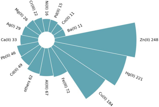 Of all the analytes, metal ions, particularly heavy ones, are of particular importance due to their dual role. On the one hand, they are distributed pollutants of air, water, and soil causing severe acute or chronic intoxication. On the other hand, many enzymes that are crucial for maintaining the vital functions of microorganisms, plants, fungi, and mammals depend on such ions as Fe2+, Fe3+, Cu2+, Zn2+, Ni2+, and others. It is important to monitor the concentration of these cations in living tissues in real time; moreover, they provide the possibility to visualize the cells using a specific fluorescent indicator if its luminescence intensity is enhanced or quenched due to interaction with metals. It is no wonder that interest in the development of fluorescent sensors draws the attention of researchers more and more (Figure 1).