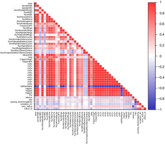 Pearson correlation matrix (‘amw’—molecular weight; ‘lipinskiHBA’—number of Lipinski H−bond acceptors; ‘lipinskiHBD’—number of Lipinski H−bond donors; ‘NumRotatableBonds’—number of rotatable bonds; ‘NumHBD’—number of H−bond donors; NumHBA’—number of H−bond acceptors; ‘NumHeavyAtoms’—number of heavy atoms; ‘NumAtoms’—total number of atoms; ‘NumHeteroatoms’—number of heteroatoms; ‘NumAmideBonds’—number of amide bonds; ‘FractionCSP3’—fraction of C atoms that are sp3 hybridized; ‘NumRings’—number of rings; ‘NumAromaticRings’—number of aromatic rings; ‘NumAliphaticRings’—number of aliphatic (containing at least one non−aromatic bond) rings; ‘NumSaturatedRings’—number of saturated rings; ‘NumHeterocycles’—number of heterocycles; ‘NumAromaticHeterocycles’—number of aromatic heterocycles; ‘NumSaturatedHeterocycles’—number of saturated heterocycles; ‘NumAliphaticHeterocycles’—number of aliphatic (containing at least one non−aromatic bond) heterocycles; ‘NumSpiroAtoms’—number of spiro atoms (atoms shared between rings that share exactly one atom); ‘NumBridgeheadAtoms’—number of bridgehead atoms (atoms shared between rings that share at least two bonds); ‘NumAtomStereoCenters’—number of atomic stereocenters (specified and unspecified); ‘NumUnspecifiedAtomStereoCenters’—number of unspecified atomic stereocenters; ‘labuteASA’—Labute ASA value; ‘tpsa’—topological polar surface area value; ‘CrippenClogP’—partition coefficient; ‘CrippenMR’—molar refractivity; ‘chi0v’, ‘chi1v’, ‘chi2v’, ‘chi3v’, ‘chi4v’, ‘chi0n’, ‘chi1n’, ‘chi2n’, ‘chi3n’, ‘chi4n’—Chi Indexes; ‘hallKierAlpha’—Hall–Kier alpha value; ‘kappa1’, ‘kappa2’, ‘kappa3’—Kappa shape indexes; ‘Phi’—index of molecular flexibility; ‘cation’—cation; ‘valence’—valence; ‘vdw’—Van der Waals radius; ‘pauling_electronegativity’—Pauling electronegativity; ‘ionization_eV’—ionization potential; ‘ionic_radius’—ionic radius; ‘cation_id’—cation class in dataset).