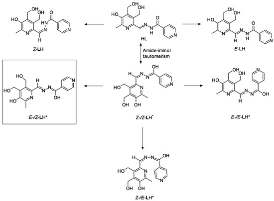 Since LH is the condensation product of an aldehyde and a hydrazide, it has great potential for isomerism and tautomerism (Figure 1). The synthetic method yields ligands in E-/Z-forms with a 2:1 ratio [23], and this mixture was used to synthesize the complexes. During the research, it was found that ligand is specific because of several reasons. Firstly, the amide form of LH contains only weak and individual donors, so a chelate cycle cannot be formed; secondly, a chelate cycle can be formed if the pyridoxine fragment is flipped, but the rotation is inhibited by the presence of two methoxy groups; and thirdly, hydrazone/iminol equilibrium is shifted to the right in the presence of alkali, but hydrazone may undergo hydrolysis to pyridoxine and isonicotine in alkaline medium. A possible isomerization mechanism is shown in Figure S3: there is an equilibrium between the E- and Z-forms of the ligand in solution, which can be shifted towards the formation of the E-form, for example via complex formation. After that, only a proton shift is required, causing the hydrazone/iminol tautomerism. Then, a rotation around the selected C-C and C-N bonds in the resonance structures can occur, leading to the LH form required for complexation.