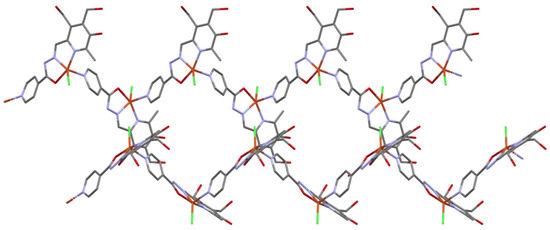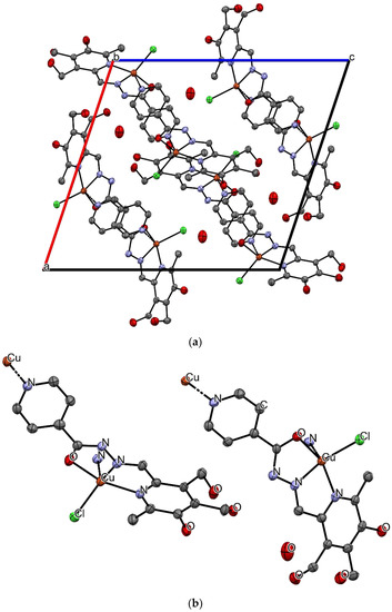 A geometry check with “Mogul” [31] was performed to determine deviations from the trends in the complex reported, and four interatomic distance values were marked as “unusual”: Cu–Npyridine, Cu–Cl, Cu–O, and C–Ocarbonyl (1.262(7) Å), but Cu–Npolymeric had no matches within the CCDC database. The Cu–Npyridine interatomic distance in similar structures has a range of 1.970–2.056 Å with a mean value of 2.022 Å [17,32,33,34], Cu–Cl has a range of 1.939–2.724 Å with a mean of 2.518 Å [17,33], Cu–O has a range of 1.918–1.983 Å with a mean of 1.951 Å [35], and C–O has a range of 1.234–1.326 Å with a mean of 1.288 Å [12,36]. These deviations can be explained by the fact that the isonicotinic fragment moves out of the plane of the rest of the molecule by ~35° (Figure S1), because the nitrogen atom is responsible for the growth of the polymer chain, while the oxygen atom of the deprotonated OH group, formed due to tautomerism, coordinates the copper(II), which is at an unusually large distance from the oxygen atom.