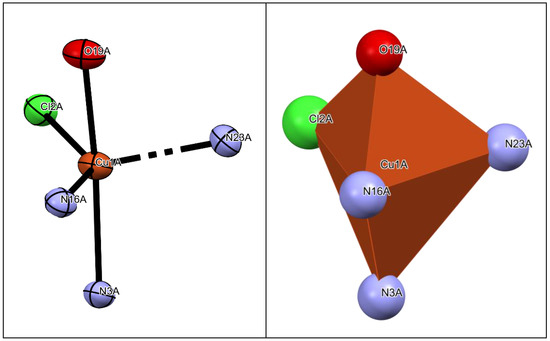 The coordinated atoms form a disordered trigonal bipyramid, which is truly unique to copper(II) complexes with non-tripod ligands and more likely for CuI [8,27,28]. Usually in complexes with hydrazones, the CuII ion has a disordered square pyramidal environment (Figure 3), which is consistent with the concept of the Jahn–Teller effect [12,17,20,24]. There are two symmetrically inequivalent copper atoms in the unit cell, Cu1A and Cu1B, so the distances between atoms coordinated to them are different. Cu1A and Cu1B interatomic distances between Npyridine, Cl, O, Nhydrazide, and Npolymeric are shown in Table 1. The Cu-Cl distance is the longest; the other four are close enough in value, and that generally corresponds to a distorted square pyramid. However, the values of the valence angles are closer to the trigonal bipyramid: N16A(hydrazide)–Cu–Cl is 140.13°, N16A–Cu–N23A(polymeric) is 146.86°, Npolymeric–Cu–Cl is 101.41°, O–Cu–N3A(pyridine) is 158.02°, O–Cu–Nhydrazide 78.66°, O–Cu–Cl 91.82°, O–Cu–Npolymeric 89.14°, Npyridine–Cu–Cl 106.96°, Npyridine–Cu–Nhydrazide 79.58°, and Npyridine–Cu–Npolymeric 97.97°. According to this, the oxygen and Npyridine atoms are in the “axial” position, and Cl, Nhydrazide, and Npolymeric are in the relative “equatorial” position. The results obtained are consistent with the theoretical concepts of the Jahn–Teller pseudo-effect predicted for fast transitions between isomers of copper(II) complexes [29,30].
