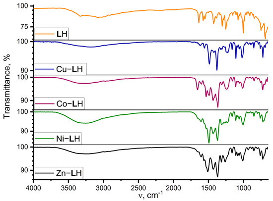 In the IR spectrum of LH in the solid state, a strong band at 1640 cm−1 is observed, which can be attributed to carbonyl groups (Figure 5). Such a shift can be explained by the conjugation with double bonds and an aromatic system, and an intermolecular H bond, which can be realized in the Z-isomer. Narrow peaks at 1257 cm−1 (νAr–OH) and 1077 cm−1 show the presence of a hydroxyl group (νCH2–OH). An intramolecular hydrogen bond (N∙∙∙HO), as well as crystalline H2O, are responsible for the broad band between 3250 and 3450 cm−1. Because of the presence of the group (-CH=N-NH-C(=O)–), the LH ligand can exhibit hydrazone–iminol tautomerism. The presence of a strong signal characteristic of the vibrations of the C=O group and the absence of a band which could be attributed to ν(=C-OH) in the spectra of the free ligand indicate that the hydrazone stabilizes the keto-tautomeric form, and it was also proved by single-crystal X-ray diffraction [23]. The doublet band with maxima at 1579 cm−1 and 1549 cm−1 corresponds to the valence vibrations of the azomethine molecule (C=N) and the skeletal (C-C) vibrations of the aromatic rings. Due to the joint effect of the mode of stretching vibrations of the N-C=O group and the N-H bond strain, the signal is recorded at 1430 cm−1. The broad bands in the complexes’ spectra can be explained by the presence of crystalline water and a large number of hydrogen bonds, which complicates their interpretation. However, the disappearance of the amide and carbonyl bands is observed for CuII, NiII, and ZnII complexes, showing the loss of the hydrazide proton as a result of complexation with the metal ion, which refers to the ligand coordination in the iminol form [37]. For the CoII complex, a strong band at 1640 cm−1 is also observed, indicating that the bond between the central ion and the ligand occurs either via hydrazide nitrogen or carbonyl oxygen, which corresponds to the constitution of the bis-complex which was detected by high-resolution ESI-MS.