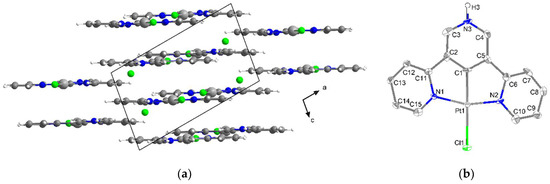 View of the crystal structure of [Pt(2,3′:5′,2″-terpyH)Cl].Cl (Pt-H2-ClCl) along the b-axis (a) and ORTEP plot of the molecular structure with displacement ellipsoids at 50% probability; H atoms other than the N–H and the Cl− counterion were omitted for clarity (b).
