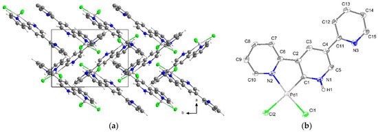 View of the crystal structure of [Pd(2,3′:5′,2″-terpyH)Cl2] (Pd-H2-Cl2) along the c-axis (a) and ORTEP plot of the molecular structure with displacement ellipsoids at 50% probability; H atoms were omitted for clarity (b).