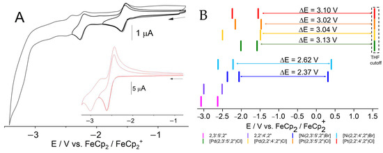 At first glance, all complexes show two reduction waves in the range of −1.5 to −3.0 V vs. ferrocene/ferrocenium (Figure 4, full data in Table S3; further cyclic voltammograms are presented in Figures S13–S18 in the Supplementary Materials). For the Pd and Pt complexes, the first reduction potentials lie around −1.5 V (Figure 4B, red and green bars), while for the Ni derivatives, far lower (more negative) values <−2.0 V were found (Figure 4B, blue bars). In view of similar complexes, these processes can be assigned to ligand (π*)-centred reductions [10,25,43,50,52,73]. Compared with the ligands, the first reduction in the complexes is massively shifted to higher potentials by about 1 V for the Pt and Pd complexes and by about 0.5 V for the Ni derivatives. At the same time, while the Ni(II) complexes’ oxidation waves assignable to a M(II)/M(III) redox pair were found at around 0.3 V, the same processes for the Pd(II) and Pt(II) derivatives are shifted to far higher potentials and could not be detected in THF solution due to solvent discharge at around 1.5 V. Nevertheless, assuming the solvent discharge limit as the minimal oxidation potential (Figure 4B), the experimental electrochemical gaps between the highest occupied molecular orbital (HOMO) and the lowest unoccupied molecular orbital (LUMO) lie higher than 3 V for the Pd(II) and Pt(II) complexes, while they can be unequivocally determined as 2.37 and 2.62 eV for the Ni(II) complexes. The lowest reduction potential and the lowest gap was found for [Ni(2,3′:5′,2″-terpy)Br] (Ni-2-Br), which is the symmetrical variant of the two Ni(II) complexes.