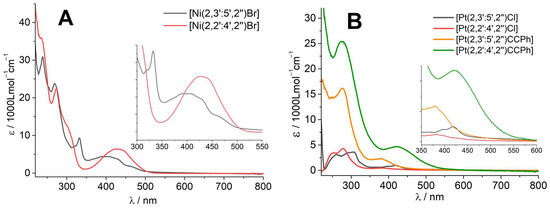 The UV-vis absorption spectra of the Ni(II) complexes show several intense bands in the UV range up to 300 nm (Figure 5A). Since they also occur for the ligands (Table S4, Figure S19 in the Supplementary Material), we can assign them to transitions into π–π* states. It is interesting to note that while the spectra of the ligands (including all derivatives in Scheme 3K,L) are pretty similar (Figure S19 in the Supplementary Material), the UV part for the complexes of the 2,3′:5′,2″ and 2,2′:4′,2″ ligands are markedly different (Figure 5 and Figure S20–S22). We explain this through the different impact of planarisation through coordination, especially coinciding with the higher symmetry for the 2,3′:5′,2″ complexes. The UV bands are followed by broad, partially structured absorptions in the range of 300 to 500 nm, which can be assigned to transitions into metal-to-ligand charge transfer (MLCT) states, similar to what has been found for the N^C^N cyclometalated complexes [Ni(dpb)X] (X = Cl or Br) [50] and their derivatives [43]. Very similar long-wavelength MLCT bands are also found for the Pd and Pt complexes (Figure 5B, Table 3). The energies of the long-wavelength absorption bands decrease along the series Ni > Pt > Pd, as has also been observed for the [M(Me2dpb)Cl] (M = Pt, Pd, Ni) complexes [43] and other series of complexes of the nickel group [44,64,65,74].