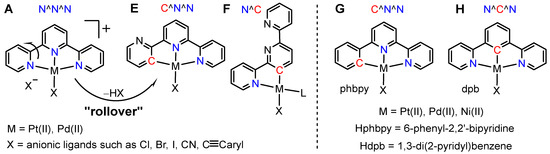 (A) Cationic N^N^N-coordinated cationic Pt(II) and Pd(II) complexes of 2,2′:6′,2″-terpyridine; potential (E) C^N^N- or (F) N^C-coordinated terpy derivatives in neutral M–X complexes; M–X complexes of the prototypical C^N^N and N^C^N coordinating ligands −phbpy (G) and −dpb (H).