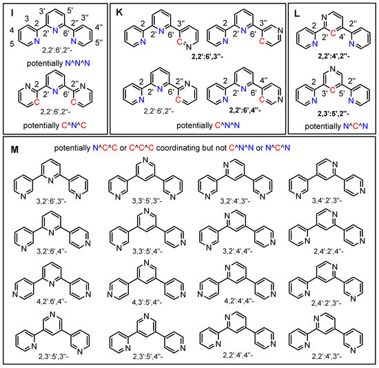 Representation of 2,2′:6′,2″-terpyridine (terpy) and the so-called ring-confused stereoisomers (with numbering). (I) N^N^N and potential C^N^C binding mode of the parent 2,2′:6′,2″ derivative; (K) potentially N^N^C (C^N^N) binding isomers; (L) potentially N^C^N binding isomers; and (M) further isomers. The derivatives studied in this work are marked in bold in (K,L) Note that there is only one 2,2′:6,3″ derivative, but this has two different options for cyclometalation.