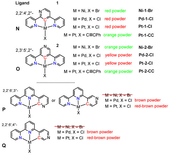 Being interested in comparative studies of isoleptic Pt(II), Pd(II), and Ni(II) complexes [39,43,44,64,65], we started to explore the capacity of the 2,2′:6′,3″ and 2,2′:6′,4″-terpy isomers for C^N^N cyclometalation (Scheme 3K), as well as the capacity of the 2,2′:4′,2″ and 2,3′:5′,2″ isomers for N^C^N cyclometalation (Scheme 3L).