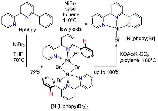 Attempts to react NiBr2 in the same way with the potentially C^N^N coordinating 2,2′:6′,3″-terpy and 2,2′:6′,4″-terpy led to orange–red solutions from which we could not isolate any material with the expected elemental composition, NMR spectrum, or MS pattern. Further attempts using [Ni(DMF)Br2] as precursor also failed (more details in the Materials and Methods section). This is remarkable as we previously reacted the protoligand Hphbpy (Scheme 2G) with NiBr2 in the same way and obtained [Ni(phbpy)Br] with excellent yield [51]. In this previous study, we also showed that the N^N pre-coordination of Hphbpy plays an important role in the cyclometalation reaction (Scheme 5).