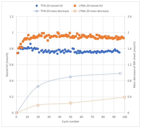 - Dieterich, M.; Pohlmann, C.; Bürger, I.; Linder, M.; Röntzsch, L. Long-Term Cycle Stability of Metal Hydride-Graphite Composites. Int. J. Hydrogen Energy 2015, 40, 16375–16382. [Google Scholar] [CrossRef]