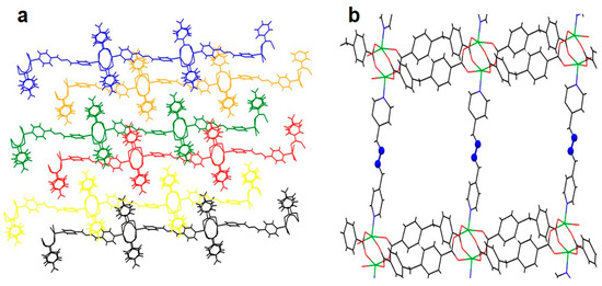 MOFs are often three-dimensional, although some two-dimensional MOFs have recently been developed [2,32]. In recent years, the construction of 2D MOFs has received a lot of attention owing to their fascinating structural features, such as their high surface area, high density of exposed functional sites, and capacity for more interactions between the substrate molecules and MOF surface, which are advantageous for various applications [33,34,35]. The 2D extended network can offer favorable performance in processes such as light harvesting and rapid electron and energy migration. Therefore, 2D MOFs have shown high applicatory potential in electronics, chemical sensing, catalysis, and gas separation [36,37].