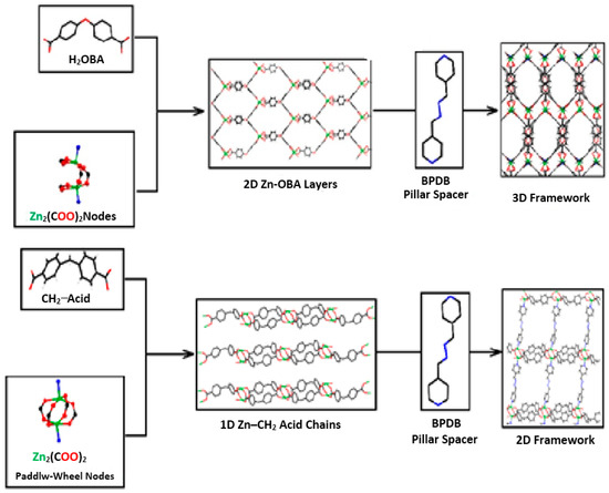 Two similar pillar-layered metal–organic frameworks have been reported [41], which incorporate a similar linker (H2oba) and the same pillar ligands (bpdb and bpdh); azine-decorated TMU-4 with the formula [Zn(oba)(bpdb)0.5]n·2DMF; and azine–methyl-functionalized TMU-5 with the formula [Zn(oba)(bpdh)0.5]n·1.5DMF, where H2oba = 4,4′-oxybis(benzoic acid), bpdb = 1,4-bis(4-pyridyl)-2,3-diaza-1,3-butadiene, and bpdh = 2,5-bis(4-pyridyl)-3,4-diaza-2,4-hexadiene. Figure 4 presents two different linkers, H2oba and H2cba, but the same bpdb pillared ligands were applied for the preparation of two structurally different MOFs, TMU-4 and 2DTMU-1, along with their 3D and 2D structures.