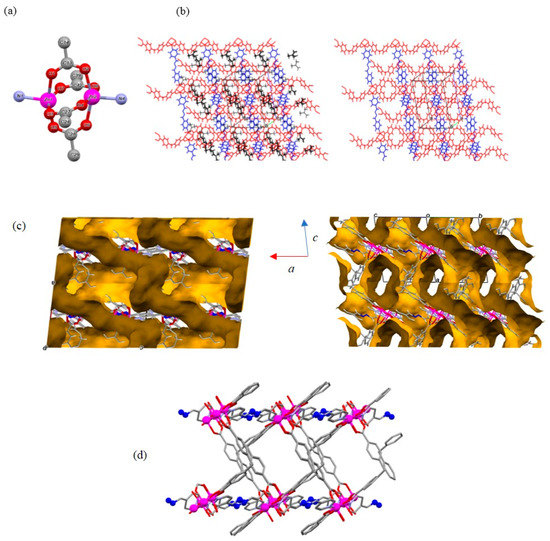 (a) Representation of the Zn2 paddlewheel unit within 2DTMU-1. (b) Layers of Zn(II)-cba (in red) pillared with bpdb (in blue) along the c direction in the presence (left) or absence of solvent (right). (c) Connolly surface representation along b-axis (left) and bc direction (right), showing that 2DTMU-1 is porous and comprises interconnected pores. (d) Representation of the pores, highlighting the azine groups (in sea blue). Color code: O—red; N—blue; C—gray; and Zn—magenta. Connolly surface: gold represents the outside of the surface, and dark gold represents the inside of the surface.