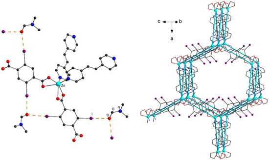 The isostructural 1 and 2 comprise {Zn(I2-bdc)2L2} SBUs (Figure 3, left) that connect with each other in a 3D diamond-like framework (Figure 3, right). The whole structure represents four-fold interpenetration of the frameworks (Figure 4), keeping voids decorated by I atoms. Two crystallographically independent DMF molecules are localized, completely filling the voids; free volume in the absence of the DMF molecules is estimated to be ca. 25%. Structures 1 and 2 reveal shortened contacts I···O (2.98–3.10 Å) between the DMF and I2-bdc; these values are less than the sum of corresponding Bondi’s van der Waals radii (3.50 Å). Via these contacts, each DMF molecule binds with two I atoms. These interactions can be regarded as halogen bonding (XB), and it becomes evident that they are responsible for ordering of guest molecules within the pores. To the best of our knowledge, this is one of the first cases of such ordering or organic molecule achieved due to XB [55,56]. In addition, as mentioned above, it is very likely that these interactions play an important role in overall stabilization of both these MOFs.