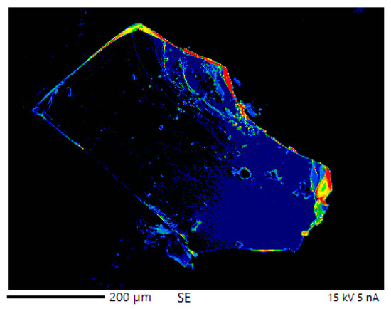 In addition, SEM images of the crystals were taken to facilitate the selection of suitable measuring points and to identify any impurities that may be present on the crystal surface. An exemplary SEM picture of the surface of an investigated single crystal is given in Figure 1 and additional images can be found in Figures S1–S9 in the Supplementary Materials.
