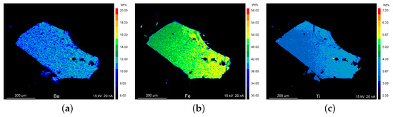WDS measurements were performed on all the single crystals discussed in this work, applying various standard materials for higher accuracy, in order to determine the compositions and prove the absence of significant composition gradients. As the quantification of light elements such as oxygen with WDS is prone to large errors, its values were calculated assuming Ba, Fe and Ti, thus slightly overestimating the oxygen content in case of the presence of minor Fe contributions. The results for the calculated compositions can be found in Table 1 and the corresponding measurement data are listed in Tables S1–S3 in the Supplementary Materials.