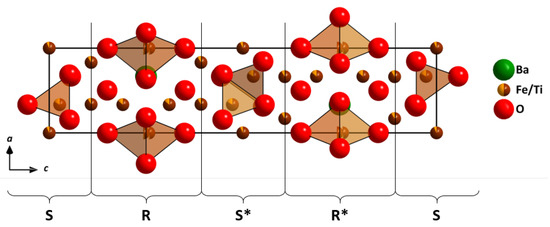 In general, the M-type structure consists of hexagonal and cubic close-packed layers of oxide anions and alkaline earth metal (here barium) cations with metal ions in tetrahedral, trigonal bipyramidal and octahedral voids. These layers can be combined to different blocks, whose sequence reflects the stacking order. The block-stacking sequence of M-type ferrites is SRS*R*, with * indicating a rotation of the block around the c-axis by 180. An expanded unit cell of BaFeTiO with labeled blocks can be seen in Figure 3, and its SCXRD measurement data are listed in Tables S13–S15 in the Supplementary Materials.