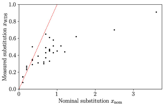 Degree of substitution according to WDS plotted against nominal degree of substitution from synthesis . The dashed red line symbolizes the trend if full incorporation of titanium into the ferrite during synthesis were to occur.