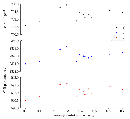 Initially, a and c increase monotonically with a rising amount of titanium(IV) up to . For higher a drop in the cell parameters is observed, followed by a slight increase. Additionally, the values for samples with reveal substantial scattering.