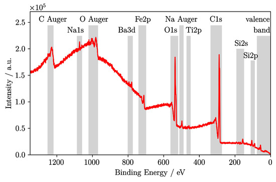 Five titanium substituted M-type ferrite crystals with degrees of substitution according to WDS, as listed in Table 1, were additionally investigated with XPS. If possible, for statistical purposes several points were chosen at the surface of one crystal for measurement, data fitted and atomic ratios calculated. The qualitative analysis of the XPS spectra was performed with help of the database by Moulder et al. [28]. For example, an XPS survey spectrum of BaFeTiO is shown in Figure 8. Among the five overview spectra of the studied samples, the presented graph shows the highest titanium signal (∼458 eV) due to the highest degree of substitution present. In the Supplementary Materials all recorded survey spectra are shown in Figures S22–S32. In Table 3 all discussed measured binding energies and the corresponding literature are listed.