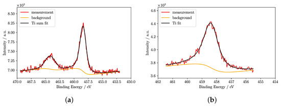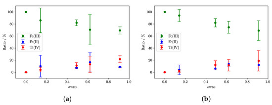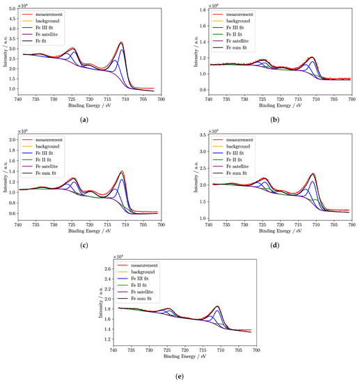 From the fitted signals the integrals were calculated. With the integrals, cross sections from J.J. Yeh and I. Lindau [36] and transmission functions from Avantage software [37] the ratios of iron(III), iron(II) and titanium(IV) were calculated and the results are listed in Tables S16–S21 in the Supplementary Materials. The arithmetic average of all points was calculated for determining the final ratios. From these, the compositions were determined as well. The results are listed in Table 4 and the ratios are plotted in Figure 12.