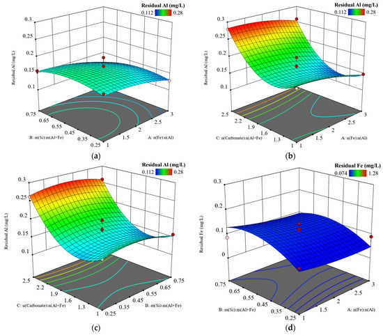 The three-dimensional (3D) response surface plots were used to reflect the interactions among input variables and the effects on output responses. Referring to Figure 1a–c, the residual Al concentration decreased slightly as n(Fe):n(Al) increased from 1 to 3. However, it was little affected by m(Si):m(Al+Fe). Although residual Al concentration was stably below 0.20 mg/L when n(CO32−):n(Al+Fe) was no greater than 1.75, it increased evidently for the ratio greater than 1.75. The significance of the effect of n(CO32−):n(Al+Fe) was in agreement with its p-value of less than 0.05. Aluminum hydrolysates could be in the dissolved state for n(CO32−):n(Al+Fe) above 1.75. Under this condition, carbonate and hydrophobic silica were negatively charged and competed with the positively charged aluminum hydrolysates, hindering the formation of aluminosilicate sites and Al–O–Si covalent bonds and resulting in higher residual Al concentration in the supernatant [20,26,27].