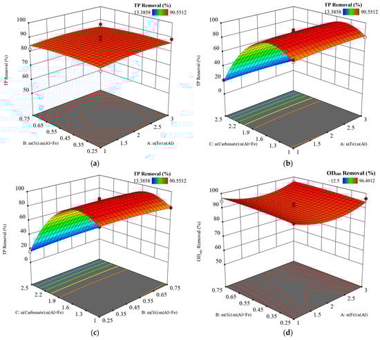 3D response surface plots for removal efficiencies of (a–c) TP and (d–f) OD680.