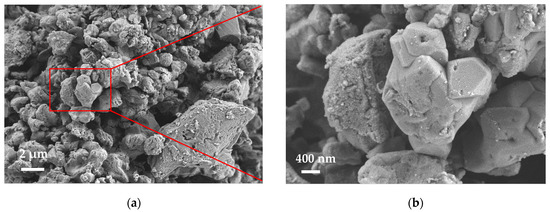 The SEM micrographs of the selected FAS samples and raw materials are shown in Figure 3 and Figure S6. Figure S6 shows that the ferrous sulfate heptahydrate was in columnar crystals, aluminum sulfate octadecahydrate was in lamellar crystals, sodium carbonate was stacked by angular strips, and hydrophobic silica was dense and smooth. Significant morphological changes are observed in Figure 3. The morphology of the sodium carbonate was hardly observed in the selected FAS samples. Many clustered nanoparticles of different sizes were irregularly distributed on the surfaces of the columnar or lamellar crystals. Only the morphology of hydrophobic silica had little change, indicating that almost all sodium carbonate reacted with the surface layer of the ferrous sulfate heptahydrate and aluminum sulfate octadecahydrate crystals. The crystals of ferrous sulfate heptahydrate and aluminum sulfate octadecahydrate were observed more in FAS5 and FAS7 than in FAS13. FAS13 had more agglomerated nanoparticles on the surface of columnar and lamellar crystals, suggesting that n(CO32−):n(Al+Fe) of 1.75:1 favored the reaction between the raw materials and the generation and attachment of nanoparticles.