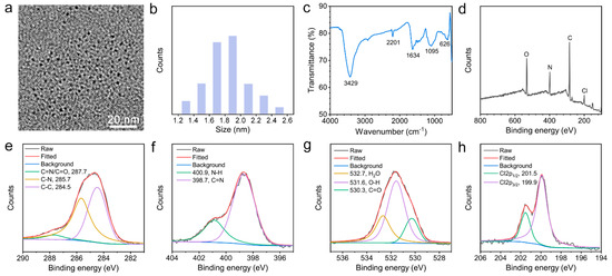 Characterization of dual-exciting central CNCs. (a) TEM image, (b) size distribution, (c) FT-IR spectrum, (d) XPS spectrum, (e) C1s spectrum, (f) N1s spectrum, (g) O1s spectrum and (h) Cl2p spectrum of CNCs.