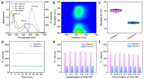 The optical properties of CNCs are investigated in detail by absorption and FL spectra. As shown in Figure 2a, the absorption spectrum of CNCs exhibits two strong absorption bands at 257 and 407 nm, which are due to the π−π * transition of the conjugated sp2 structure and n−π * transition of aggregated fluorescent groups [29]. Correspondingly, two excitation peaks have been found at 257 and 417 nm in the excitation spectrum of the CNCs. No matter if excited at 260 (channel 1) or 410 nm (channel 2), only one green emission peak of about 518 nm can be obtained, and there is only a diversity in intensity between the two. This unique dual-exciting central emission phenomenon is clearly displayed on a three-dimensional (3D) FL spectrum. The result (Figure 2b) shows that the CNCs show an excitation-independent green FL emission that can be excited at two excitation centers.