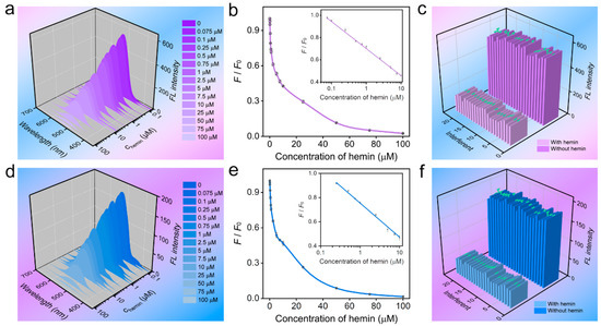 Hemin, a well-known natural porphyrinatoiron complex, is an indispensable substance in living organisms, which has important roles in the regulation of oxygen transport, gene expression, hemoglobin synthesis, and other physiological processes [10,11,12]. Hemin is composed of a porphyrin ring containing four pyrrole molecules and Fe3+ ions located at the center, which can keep stable in the body as a cofactor of hemoglobin without resulting in hemolysis and inflammation [13]. Hemin is abundant in living organisms mainly as an electron transfer medium according to the reversible redox reaction of Fe3+/Fe2+ [14]. Excessive or lack of hemin is not beneficial for human health; this deficiency may cause neuroglobin expression in neural cells and accelerate the formation of endogenous CO, while an excess may lead to permanent brain secondary damage after a hemorrhagic stroke [15]. In addition, hemin can not only serve as a natural iron supplement for the treatment of iron deficiency anemia but also acts as a raw material for the synthesis of semi-synthetic bilirubin and anticancer medicines [16]. Therefore, accurate determination of hemin is of great significance for the early diagnosis of diseases and analysis of medical content. Dual-channel sensing platforms provide a great potential for highly sensitive and reliable detection of hemin, which exhibits incomparable advantages such as more reliable analysis results in comparison to other traditional methods, including chemiluminescence [16], electrochemiluminescence [17], and surface-enhanced Raman scattering [18] techniques.