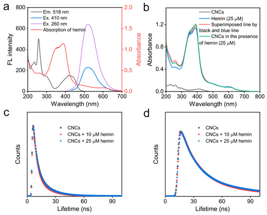The sensing mechanism of hemin using CNCs. (a) Overlap degree of the absorption band of hemin and excitation and emission bands of CNCs at two channels. (b) The absorption spectra of CNCs in the absence and presence of hemin. (c) Time-resolved decay of CNCs before and after adding hemin (10 mM or 25 mM). Excitation: 260 nm. (d) Time-resolved decay of CNCs before and after adding hemin (10 mM or 25 mM). Excitation: 410 nm.