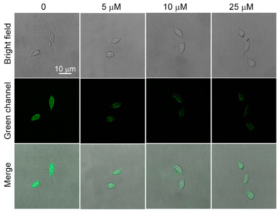 Before cell imaging, the cytotoxicity of CNCs is tested. The cytotoxicity of CNCs is relatively low based on the result of the CKK-8 assay assessment (Figure S3), and over 90% HeLa cell viability is observed after 24 h incubation with the CNCs (0.05–5 mg/mL). The real-time monitoring of the dynamic invasion process of hemin into HeLa cells is further investigated. As shown in Figure 5, HeLa cells display bright green FL after incubation with CNCs for 2 h, indicating that CNCs efficiently enter into the cells by endocytosis. Some reports reveal that both caveolae- and clathrin-mediated endocytosis is the main cellular uptake mechanism of nanocarbon [34], indicating that multiple endocytosis pathways may cause the high transfection efficiency of CNCs. After the addition of hemin for 30 min, the green FL of CNCs is effectively quenched, and the degree of quenching is closely related to the concentration of hemin. Therefore, the proposed CNCs can be used as fluorescent nanoprobes to monitor the dynamic intrusion process of hemin into cells.