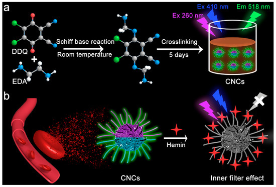 The synthesis of CNCs is achieved by the Schiff base reaction between DDQ and EDA. Briefly, 10 mg DDQ and 0.3 mL EDA are added to 4.7 mL ultrapure water in turn. The CNCs can be formed after 5 days of room-temperature reaction. The proposed CNCs are dialyzed using a 100–500 MWCO dialysis membrane for 2 days.