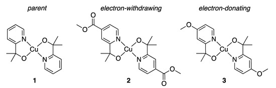 Complexes investigated in this study: the parent complex Cu(pyalk)2 (1), Cu(4-MeOOCpyalk)2 (2), and Cu(4-MeOpyalk)2 (3).