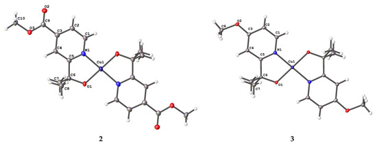 The ligands 4-MeOOCpyalkH and 4-MeOpyalkH were synthesized using a procedure modified from the literature [28,29], and complexation was accomplished by combining the ligands with Cu(OAc)2 in the presence of KOH (see Section 3). Single crystals of both 2 and 3 were grown via the slow diffusion of pentane into a dichloromethane solution for characterization using X-ray diffraction. The crystals of 2 tended to be small and poorly diffracting, so required the addition of a few drops of pyridine as a co-solvent in order to obtain X-ray-quality crystals. The structures of both 2 and 3 show a bis-ligated, square planar Cu center, with the ligands in a trans orientation (Figure 2). This is consistent with what was previously reported for 1 [24]. The structural parameters (bond distances and angles) of the three complexes are remarkably similar, indicating a well-conserved active site structure (Table 1). Notably, even with the addition of organic substituents, all three complexes were water-soluble, which is advantageous in a homogeneous system designed to oxidize water.
