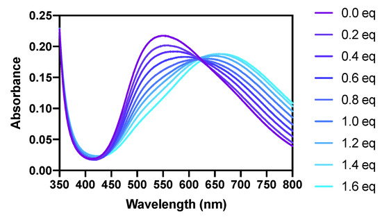 The UV–vis titration of Cu(4-MeOpyalk)2 (3) with hydrochloric acid is shown. There is a clear isosbestic point, allowing for the determination of the pKa.