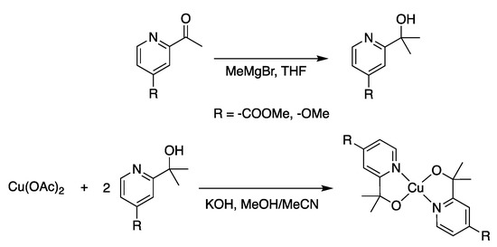 - Shopov, D.Y.; Sharninghausen, L.S.; Sinha, S.B.; Mercado, B.Q.; Brudvig, G.W.; Crabtree, R.H. Modification of a Pyridine-Alkoxide Ligand during the Synthesis of Coordination Compounds. Inorganica Chim. Acta 2019, 484, 75–78. [Google Scholar] [CrossRef]