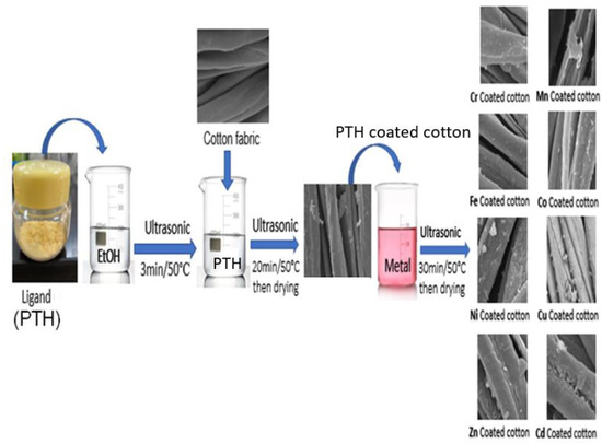 As shown in Figure 1, in a 100 mL beaker, we added 1 mmol (0.34 g) of the ligand to 30 mL ethyl alcohol. After that, it was put in the ultrasonic water bath for 3 min at 50 °C until the ligand dissolved, followed by immersing the fabric in the prepared mixture for 20 min at 50 °C, then dried in the oven at 60 °C for 10 min to produce PTH-modified cotton (PTH-C). The ligand–cotton fabric was immersed in a beaker of 30 mL EtOH; then, we added 1 mmol of CrCl3·6H2O, MnCl2·4H2O, FeCl3·6H2O, CoCl2·6H2O, NiCl2·6H2O, CuCl2·2H2O, ZnCl2 or CdCl2·2.5H2O. The beaker was put in a water bath ultrasonic device for 30 min at 50 °C, after that, the textile was dried at 60 °C for 10 min to produce metal–pyrimidinethione hydrazide-modified cotton (M-PTH-C).