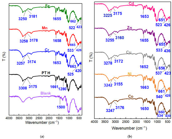 FT-IR spectra of (a) Blank cotton, PTH-C, Cr-PTH-C, Mn-PTH-C, and Fe-PTH-C; (b) Co-PTH-C, Ni-PTH-C, Cu-PTH-C, Zn-PTH-C, and Cd-PTH-C.