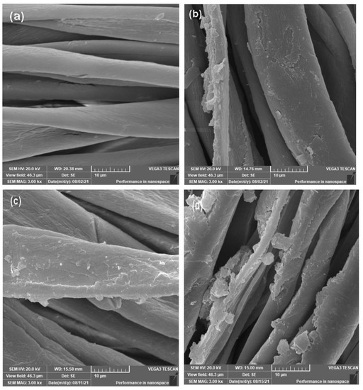 Table 3 shows that the amount of chemicals deposited on the surface of cotton fabric presented as the values of add-on measurements. In addition, Table 3 represents the tensile strength of modified cotton fabric. As presented in Table 3, the add-on values varied between 1.58% and 4.30%. Moreover, a slight decrease in the tensile strength values is also noticeable. This may be attributed to the various modifications to the cotton fabric [39,40].