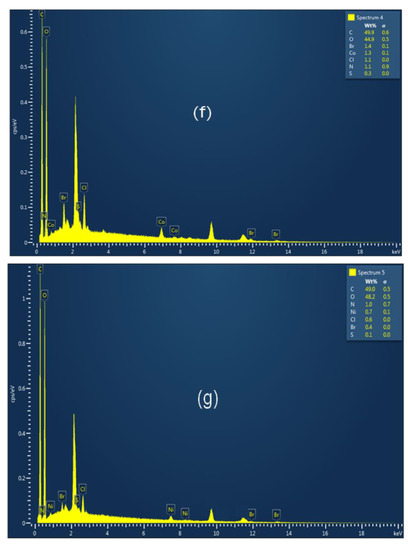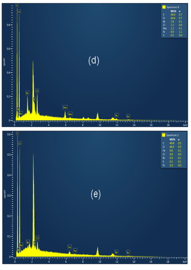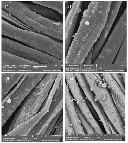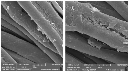 The deposition of PTH with its metal complexes on the surface of cellulose fabric was confirmed by using SEM and EDX analysis. SEM images appeared the morphological properties of uncoated and coated surfaces of fabrics. Figure 4 illustrates SEM images of the blank cotton fabric and M-PTH-C complexes. The blank cotton surface was very smooth and clear with characteristic parallel grooves, as shown in Figure 4a. In contrast, the sample coated with PTH in Figure 4b shows a rough surface coating layer of PTH on the surface of the fabric rather than a surface that is clear, smooth, and streamlined. In addition, some granules, agglomerated particles, and pores are found on the surface of the fabric for all samples coated with pyrimidine hydrazide–metal complexes. As can be seen in Figure 5, the EDX data also provided some very useful information confirming the SEM findings. The elemental analysis of the coated fabric was strengthened by the EDX spectra. The EDX results of blank cotton showed only carbon and oxygen. The presence of new elements (Br, N and S) in the PTH-C sample is an indication of its successful treatment with the ligand. In addition, the presence of the used metal element in Figure 4c–j is an indication of the successful treatment of the cotton samples with the metal.
