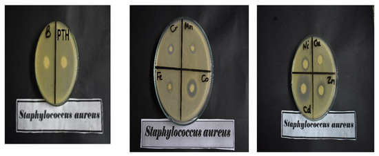 Images of the activity of B (Blank cotton), the modified cotton with PTH or different metal complexes against S. aureus.