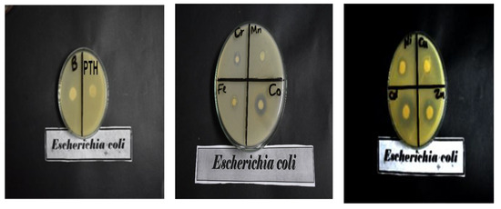 Images of the activity of B (Blank cotton), the modified cotton with PTH or different metal complexes against E. coli.