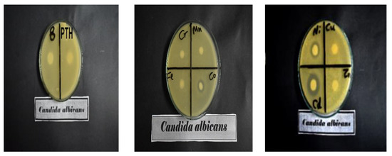Images of the activity of B (Blank cotton), the modified cotton with PTH or different metal complexes against Candida albicans.