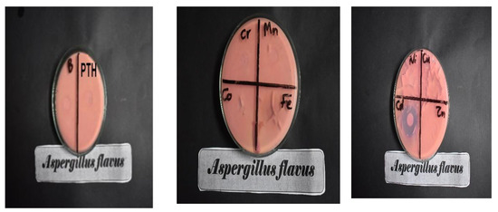 Images of the activity of B (Blank cotton), the modified cotton with PTH or different metal complexes against Aspergillus flavus.